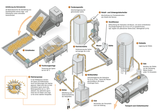 Pelletdurchmesser (je nach Matrize 6 bis 10 mm) gepresst. Durch den Druck findet eine Erwärmung statt, die das im Holz enthaltene Lignin erhitzt und verflüssigt, so dass es als Bindemittel